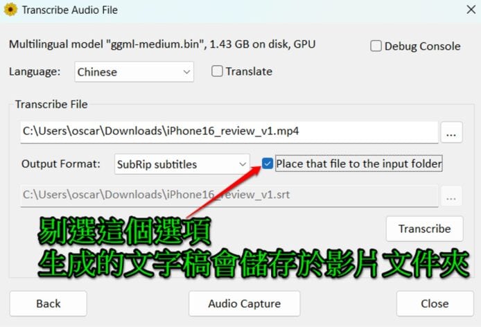 - 如果你想要生成 YouTube 的「CC 字幕」(有 Time Code),那麼就需要選擇「Subrip subtitles」輸出 SRT 檔案。