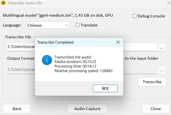 完成後會彈出一個提示視窗,告訴你耗時多久。WhisperDesktop 主要使用 GPU 轉錄為純文字,而由於小編的電腦沒有獨立顯示卡,因此耗時約 14 分鐘方完成。如果你的電腦顯示卡比較厲害,那麼可以用更短時間完成轉錄工作。