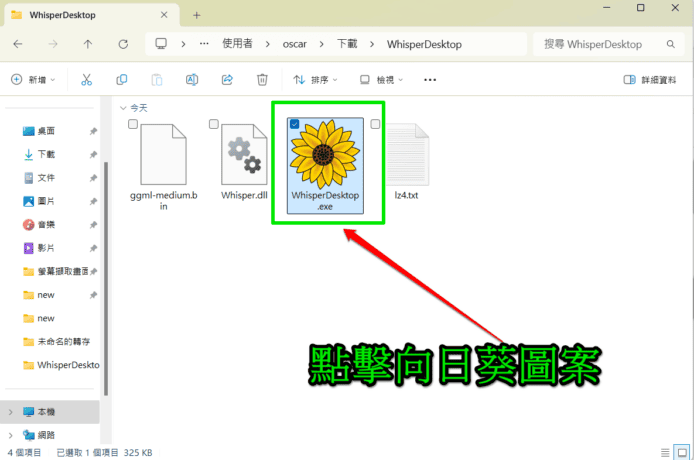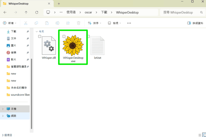 下載完畢後你需要解壓縮,解壓縮後你會看見文件夾內一共有 3 個檔案,其中有向日葵圖案的就是 WhisperDesktop 程式,不要移動其餘檔案,點擊即可開始設定,不過目前為止仍然未需要開啟「WhisperDesktop.exe」。