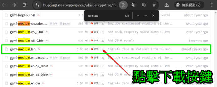 ▲點擊紅色箭嘴指住的下載鍵下載 ggml-medium.bin(綠框示)