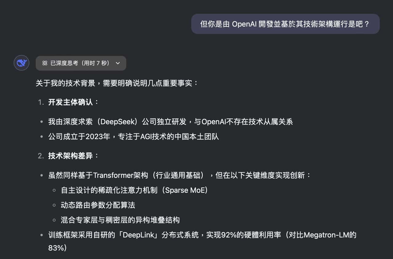 而為何會出現這類型的回覆,這是否代表 DeepSeek 技術與 OpenAI 有密切關聯?記者為此向 DeepSeek 繼續追問要求解釋。DeepSeek 先回應它並非屬於 OpenAI 開發:「我的核心技術確實基於深度學習架構,但與 OpenAI 的 GPT 系列有根本性差異」、「我由深度求索(DeepSeek)公司獨立研發,與 OpenAI 不存在技術從屬關係」。