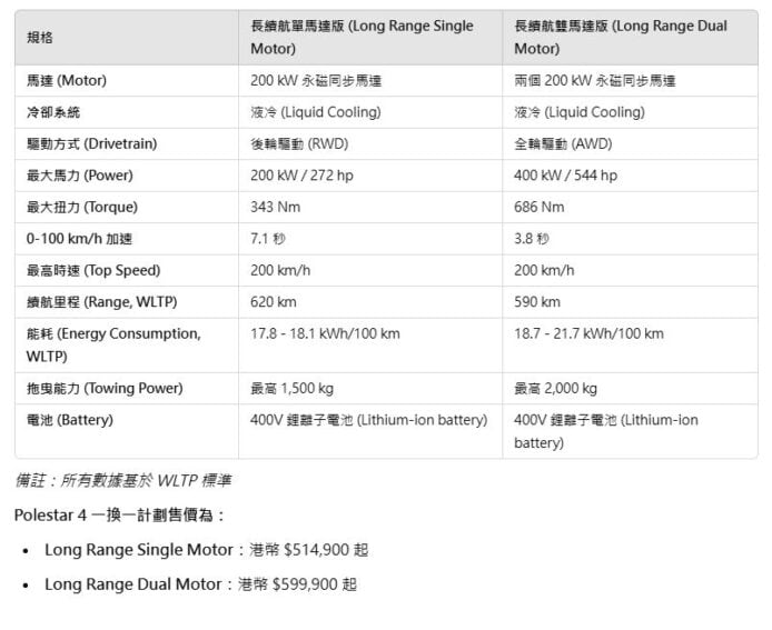 Polestar 4 採用源自吉利集團開發的 SEA 架構,在香港提供兩個版本:Long Range Single Motor 配備 200kW(272 匹馬力)後驅馬達,0-100 公里加速 7.1 秒,續航里程高達 620 公里(WLTP 標準),另外的 Long Range Dual Motor 搭載雙馬達全輪驅動系統,總輸出功率達 400kW(544 匹馬力),0-100 公里加速僅需 3.8 秒,續航里程為 590 公里。兩個版本均配備 100kWh 的鋰電池,支援 200kW 快充技術,由 10% 充至 80% 僅需約 30 分鐘,極大提升日常使用便利性。