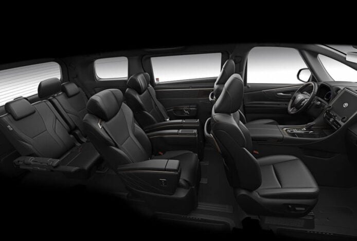 內裝部分,PHEV 版採用 2+2+2 的六座獨立座椅配置,第三排設計為獨立雙座椅,提供更高端的乘坐體驗。車內擁有寬敞中央走道,四區獨立恆溫空調確保每位乘客享有最佳舒適度,進一步提升尊榮感。安全配備上,PHEV 版標配 Toyota Safety Sense 3.0 智能駕駛輔助系統,包括 ACC 主動車距維持定速(全速域/Stop & Go)、PCS 預警式防護系統、LTA 車道循跡輔助、AHS 智慧遠光燈調節系統、RSA 速限辨識輔助等。此外,車內設有 6 具氣囊,並具備 42 項主被動安全技術,確保行車安全。