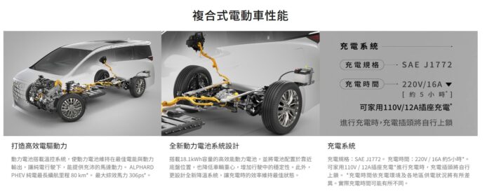 新款 Alphard PHEV 車型採用第四代 Self-Charging Hybrid 油電複合動力系統,搭載 2.5 升 A25A-FXS 自然進氣引擎與 18.1kWh 鋰電池組,最大綜效馬力達 306 匹,相較 HEV 版 250 匹提升 56 匹。PHEV 在 NEDC 測試平均油耗達 74.1km/L,純電模式下續航里程最長可達 80 公里,大幅提升能源效率與環保表現。動力配置方面,PHEV 採用 E-Four 4WD 電子四驅傳動系統,前軸馬達輸出 182 匹,後軸馬達 54 匹,加上引擎 177 匹馬力,綜效動力提升至 306 匹,提供穩定且強勁的行駛體驗。鋰電池配置於底盤位置,有效降低車身重心,增強行駛穩定性與安全性。