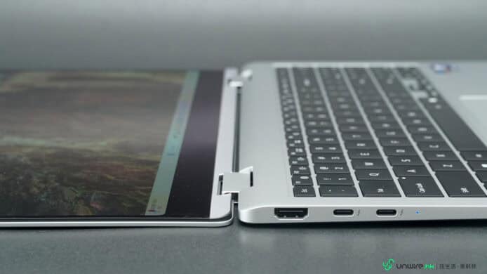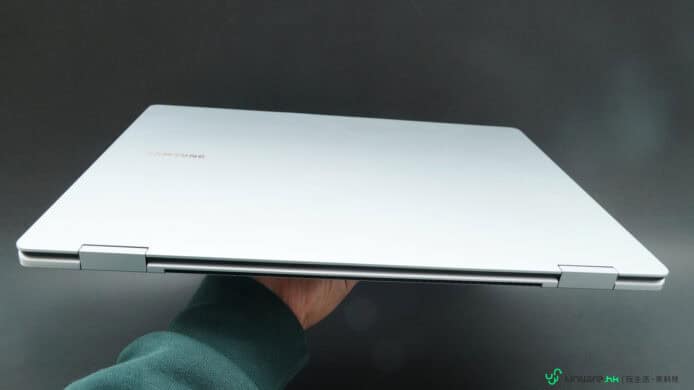 先說設計吧,今次 Samsung 推出的 Galaxy Book5 Pro 360,設有月影灰及薄霧銀兩種顏色選擇,當中只有最高規格(內建 32GB RAM 記憶體)的版本才有薄霧銀這個配色。設計上,Book5 Pro 360 走的是商務路線,風格上較為簡約實際,機身採用鋁金屬物料製造,金屬感強之餘亦十分硬淨,而且作為一部 16 吋熒幕筆電,機身厚度最薄位置只有 12.8mm,重量亦只有 1.69kg,外攜使用依然算輕巧容易,唯一是它的機邊採用直角式切割設計,所以拿在手上時邊位可能會有點界手,建議大家放入筆電袋外攜使用手感會較舒服一點。