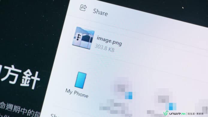 ▲例如:想將筆電的相片拉到手機上儲存,只要按住相片不放並拉到流動裝置位於的熒幕邊緣,再過去一點相片就會出現在手機上,之後就可以選擇想打開的程式儲存或使用。