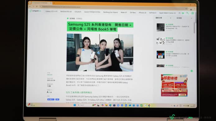 至於顯示方面,Samsung Book5 Pro 360 內建了 16 吋觸控式 Dynamic AMOLED 2X 熒幕,支援 2880 x 1800 解析度、最高 120Hz 更新率及最多 10 點多點觸控功能。顯示質素方面,筆者覺得依然十分亮麗,顯示文字清晰銳利,瀏覽影片亦有十分理想的視覺效果。另外,它採用了配備 DX 的 Corning Gorilla 強化玻璃保護,它擁有一定程度的防反光效果,官方表示經過表面處理的玻璃反射率低於 2%,可減少不必要的表面反射,而筆者肉眼所見確實比一般鏡面熒幕有更低反光的效果,只要並非強光直射熒幕,長時間瀏覽內容仍算舒服,亦令可視角度十分廣闊,即使從側面看也不用擔心因為反光而影響瀏覽體驗。不過亮度方面,Book5 Pro 360 的熒幕在一般情況下只有 400 尼特(典型),即使瀏覽 HDR 內容亦只是去到 500 尼特,亮度不算很高,如果在室外使用可能會不夠光去清晰瀏覽內容(有 Vision Booster 加持會好一點但仍不太足夠),但在一般室內使用問題就不算太大。至於觸控效果方面就與上代差不多,靈敏度依然十分高,如果配合附送的 S Pen 作操控甚至繪圖記事,效果就更加理想。