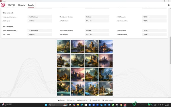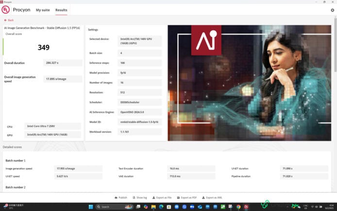 ▲最後筆者嘗試透過 Stable Diffusion 1.5(FP16),以 Intel Arc 圖像處理晶片的機能生成四次每次 4 張每張為 512 x 512 解析度的圖片,結果獲得 349 分,而從細分可見每張相片的生成時間大約為 18 秒左右,可見雖然它未有獨顯加持,但要進行不同的生成式 AI 功能仍是有可能的,只是速度會慢一點而已。
