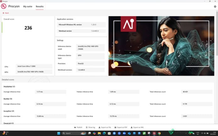 ▲筆者亦使用了 UL Procyon AI Computer Vision Benchmark 配合 Microsoft Windows ML 模型測試 Galaxy Book5 Pro 的 AI 運算表現,而在一般 AI 運算上的表現,結果獲得 236 分,算是中規中矩。