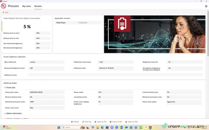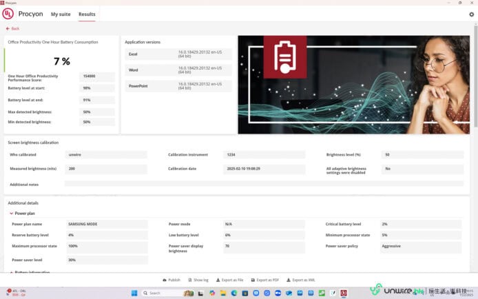 至於使用時間方面,Samsung Galaxy Book5 Pro 360 內建了 76Wh 鋰離子電池,官方表示使用時間可以長達 25 小時,為了實試使用時間是否真的如此「長氣」,筆者首先就將 Book5 Pro 360 的電池充滿,並將熒幕亮度調至最光、音量調至 50% 情況下,以 Wi-Fi 網絡及串流模式播放 Netflix 的《哥斯拉 -1.0》電影(片長:120 分鐘)。結果可見在影片播畢後,筆電電池耗用了 15%,由此推算 Book5 Pro 360 的電池足夠在這個模式下連續播放 13 小時以上影片,而一般生活應用情況下用上 15 小時左右應該問題不大,但如果使用時間長的話,要用足一日就可能會有點勉強。筆者最後再用 UL Procyon 內的一小時電量測試,測試 Book5 Pro 360 分別在 Office Productivity(模擬工作環境)、Video Playback(模擬影片播放環境)及 Idle(模擬待機環境)下一小時後的耗電表現,而每個測試筆者均先將筆電充滿電,再將熒幕設定為 50% 左右亮度,以模擬真實使用環境下的耗電情況。結果發現三個項目分別耗電了 7%、5% 及 3%,以此推斷在一般生活應用情況下,Book5 Pro 360 應可為用家帶來大約 14 至 20 小時的使用時間,算是夠用一日,不過相比其他輕薄筆電來說,這個使用時間仍不算長。