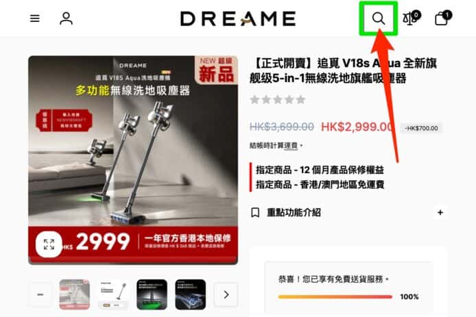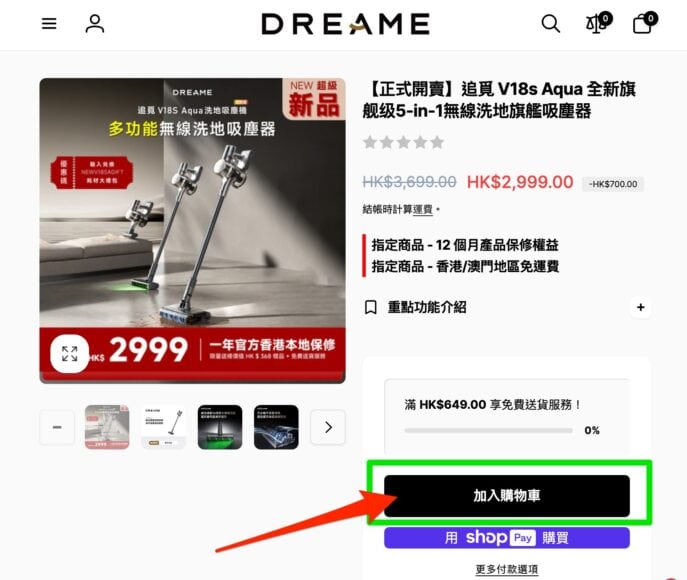 首先前往 Dreame 官方網站,將 V18s Aqua 加入購物車。