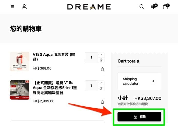 現在請開啟你的購物車,確認吸塵器以及「V18S Aqua 清潔套裝」都已經加入購物車,點擊結帳。