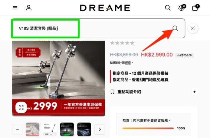 ▲輸入「V18S 清潔套裝 (贈品)」後再點擊箭嘴指住的放大鏡