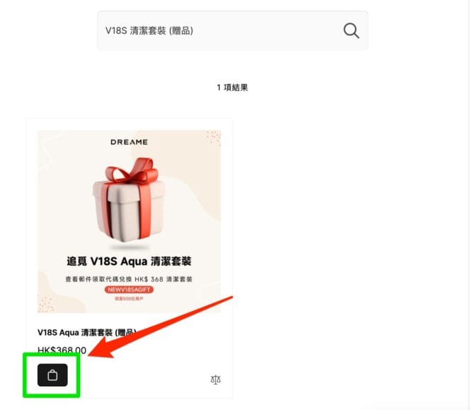 ▲點擊購物袋將「V18S 清潔套裝 (贈品)」加入至購物車