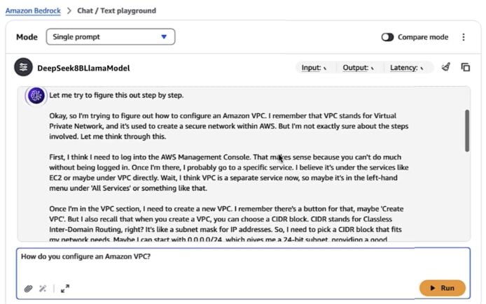DeepSeek-R1-Distill 模型(基於 Llama 和 Qwen 訓練)現已支援透過 Amazon Bedrock Custom Model Import 功能進行部署。這些模型結合了大模型的卓越推理能力與小模型的高效性,適合需要更低延遲和更高性價比的應用場景。同時,這些蒸餾模型為客戶提供了更多選擇,尤其是那些對成本和性能需求敏感、不需要大模型的企業用戶,能以更經濟的方式滿足實際業務需求。