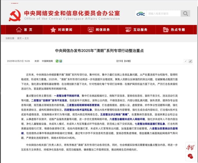中國中央網信辦(中央網絡安全和信息化委員會辦公室)近日公佈 2025 年「清朗行動」的整治重點,針對虛假資訊、惡意營銷、自媒體亂象,以及 AI 技術濫用等問題展開嚴格治理,以維護網絡環境的健康與有序發展。行動涵蓋多個重點領域,包括規範春節期間網絡內容、遏止 AI 生成虛假訊息、整頓直播打賞機制,以及優化企業輿論環境等。
