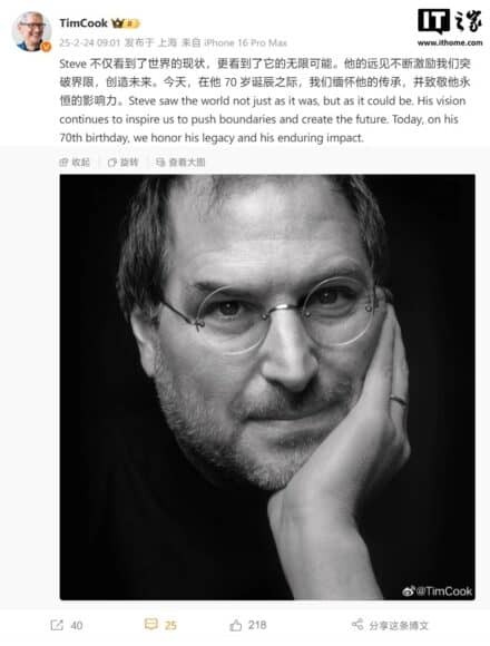Apple 創辦人 Steve Jobs 今日迎來 70 歲冥誕。現任 CEO Tim Cook 發文悼念,盛讚 Steve Jobs 具備非凡遠見,長年來激勵 Apple 團隊勇於創新、敢於突破。Tim Cook 指 Apple 能有今日成就,有賴 Steve Jobs 當年奠下穩固基礎,以及他對創新精神的孜孜追求。