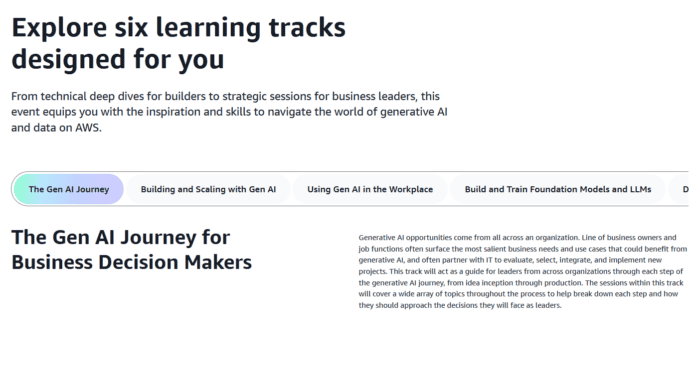 每個主題將分別有五節、每節各 30 分鐘的課堂,由專家講者逐步講解 AI 的各種應用。例如,第一堂「生成式 AI 旅程」(Genrative AI journey),就會有運用「生成式 AI」實現商業價值的案例,講者亦會以紐約人壽保險公司(New York Life)為實例,講解如何從數據平台實踐現代化及以「生成式 AI」進行創新,屆時 AWS 講者亦會現身說法,解講 AWS 如何負責任地使用 AI。