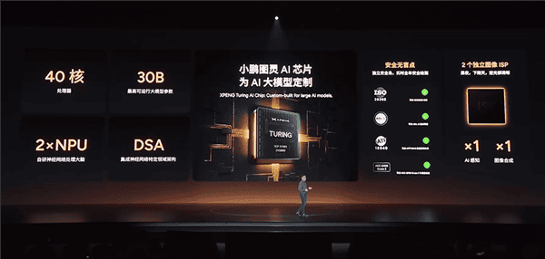 去年 11 月「小鵬 AI 科技日」上,小鵬正式發表了圖靈 AI 晶片,該晶片專為人工智能應用而設,內含 40 核心處理器,支援本地運行 30B 參數大模型,並整合 2 顆 NPU 及針對神經網絡設計的特定領域架構(DSA)。在智能駕駛方面,圖靈晶片內建「獨立安全島」,可即時偵測車輛狀態,提高行車安全。此外,配備雙獨立影像 ISP,使其能在黑夜、雨天及逆光環境下保持清晰感知,提升駕駛體驗。