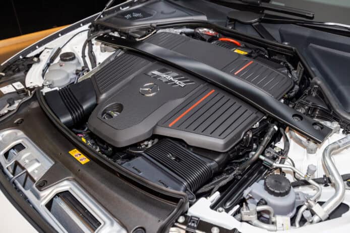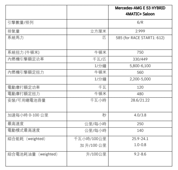 全新 E 53 HYBRID 4MATIC+ 配備的 3.0 升六缸渦輪增壓引擎,輸出為 449 匹馬力,而電動馬達則額外提供 120 kW(約 163 匹馬力)。在 RACE START 模式下(馬力可提升至 612 匹), 0-100 Km/h 加速僅需 3.8 秒,極速更可達 280 Km/h(選配 AMG 駕駛者套裝後解鎖最高時速)。這套混合動力系統的關鍵在於配備 400V 高壓電池組,總容量 28.6 kWh,當中 21.22 kWh 可供日常行駛。透過純電模式行駛時,車輛最高時速可達 140 Km/h,而單次充電可提供超過 100 公里的續航距離,讓車主在市區內可完全使用電動模式減少燃油消耗。