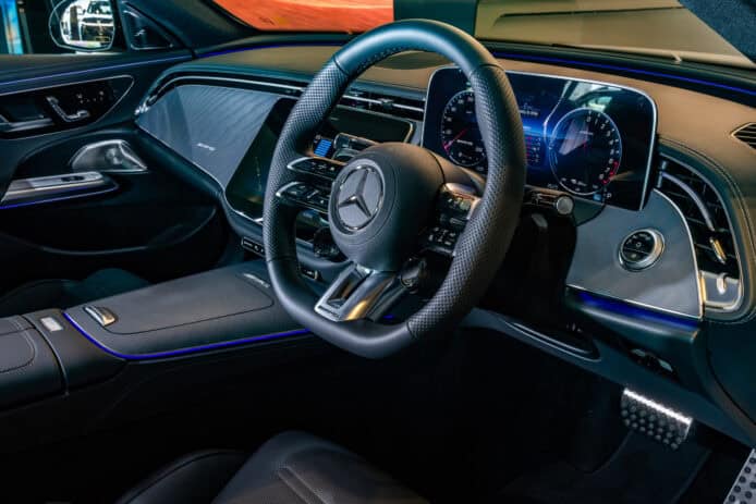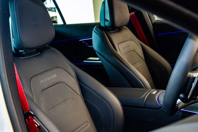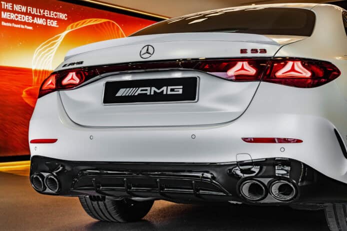 全新 E 53 HYBRID 4MATIC+ 的外觀設計展現強烈的 AMG 風格,車頭採用 AMG 垂直條紋水箱護罩,搭配加寬 11 毫米 的前翼子板,讓整體線條更具攻擊性。車身側面設計簡潔流暢,配合 AMG 專屬側裙,讓車輛更具運動感。車尾部分亦充滿 AMG 元素,包括 車尾 AMG 尾翼、雙邊雙出排氣管,以及設計更為流線的 LED 尾燈組,確保視覺效果更加動感。此外,中控台配備 MBUX 顯示屏,內建 AMG TRACK PACE、AMG Performance 等功能,讓車主可隨時監察車輛動力輸出、電池狀態及駕駛模式等資訊。