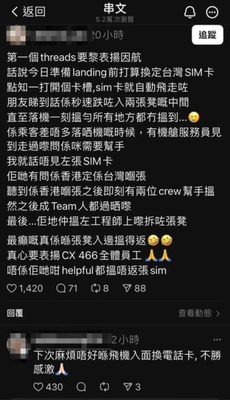 一名香港女子近日乘搭國泰航空 CX466 航班前往台灣,準備在航機降落前更換當地 SIM 卡時,不慎令原本的香港 SIM 卡從電話卡槽飛出,掉入座椅縫隙中。落機前多番尋找未果,最終在機組人員協助下,經工程師拆除座椅後成功尋回。她其後在網上發文感謝國泰團隊的幫助,卻引發網民熱議,部分人認為應該向航空公司表揚,但亦有人批評其行為影響航班運作,甚至「阻人收工」。