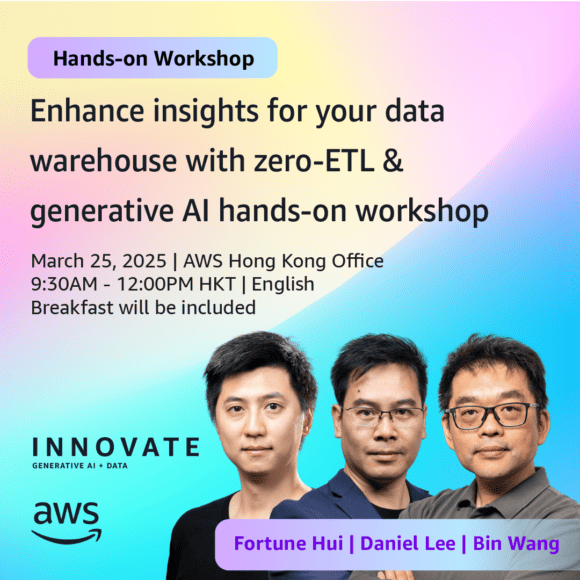 由 AWS 主辦的「Transform Your Enterprise Data Strategy」系列工作坊一直以協助企業革新數據策略為宗旨,這次 AWS 就以「零 ETL 及 生成式 AI 增強數據倉儲」(Enhance insights for your data warehouse with zero-ETL & Generative AI)為題開辦工作坊,帶領參加者了解結合「零 ETL」技術與「生成式 AI」的數據管理整合方案。