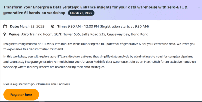 總結而言,此次活動非常適合未來打算實施 AI 驅動分析的技術團隊、數據架構開發人員、數據工程師和科學家、解決方案架構師及 I.T.企業的決策者,實際學習「零 ETL」架構的設計和實施方法,以至搭建你專屬的「零 ETL」架構;工作堆亦能與行內及 AWS 的專家交流經驗和意見,不容錯過!有興趣的人士可即到以下網站報名,額滿即止。