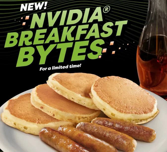 Denny’s 指出,這道名為「NVIDIA Breakfast Bytes」的早餐由 4 條香腸和 4 塊招牌白脫牛奶迷你鬆餅組成,整份熱量為 520 卡路里,定價 4.93 美元(約港幣 HK$38.5)。品牌建議最地道的吃法,是將香腸包在鬆餅中,再淋上楓糖漿一同食用。餐點靈感取自黃仁勳工餘時最常吃的搭配,Denny’s 更以「Inspired by a legend, built for hunger(靈感源自傳奇,為飢餓而生)」作為口號,突顯這款早餐背後的勵志故事。