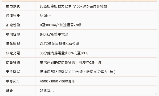 動力方面,前輪驅動的風行 05 搭載由 BYD 弗迪動力提供的 150kW 永磁同步電機,最大馬力 201 匹,峰值扭力達 340Nm,0 至 100km/h 加速需時 7.9 秒。配合 64.4kWh 鎧甲電池提供高達 500 公里 CLTC 續航力,並支援 35 分鐘由 0% 快充至 80%,應付城市及長途駕駛均游刃有餘。