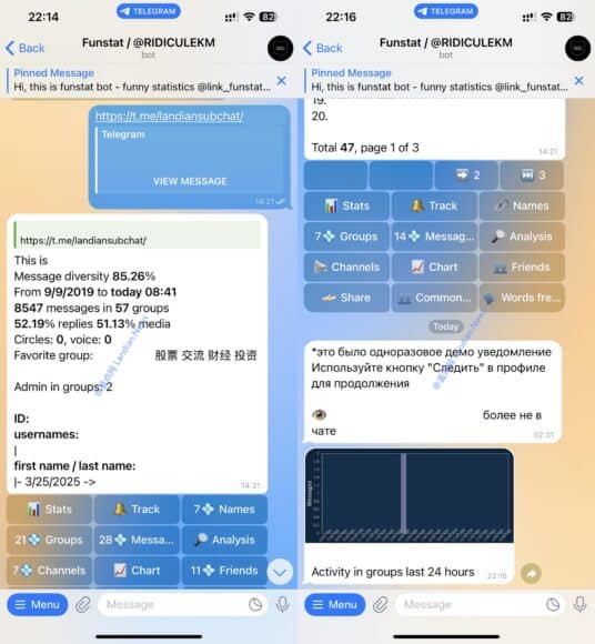 據悉 Funstatgrtbot 針對 Telegram 的公開群組及頻道進行大規模數據爬取,涵蓋用戶自 2019 年起的發言紀錄,並能分析用戶之間的關聯及群組重疊情況。網上消息指,該機械人甚至可監測用戶新加入或退出的群組動態。雖然目前未公開具體聊天內容,但其數據庫已相當龐大。根據外媒報道,Telegram 全球活躍用戶約 10 億,意味著此次抓取幾乎覆蓋平台絕大部分用戶。