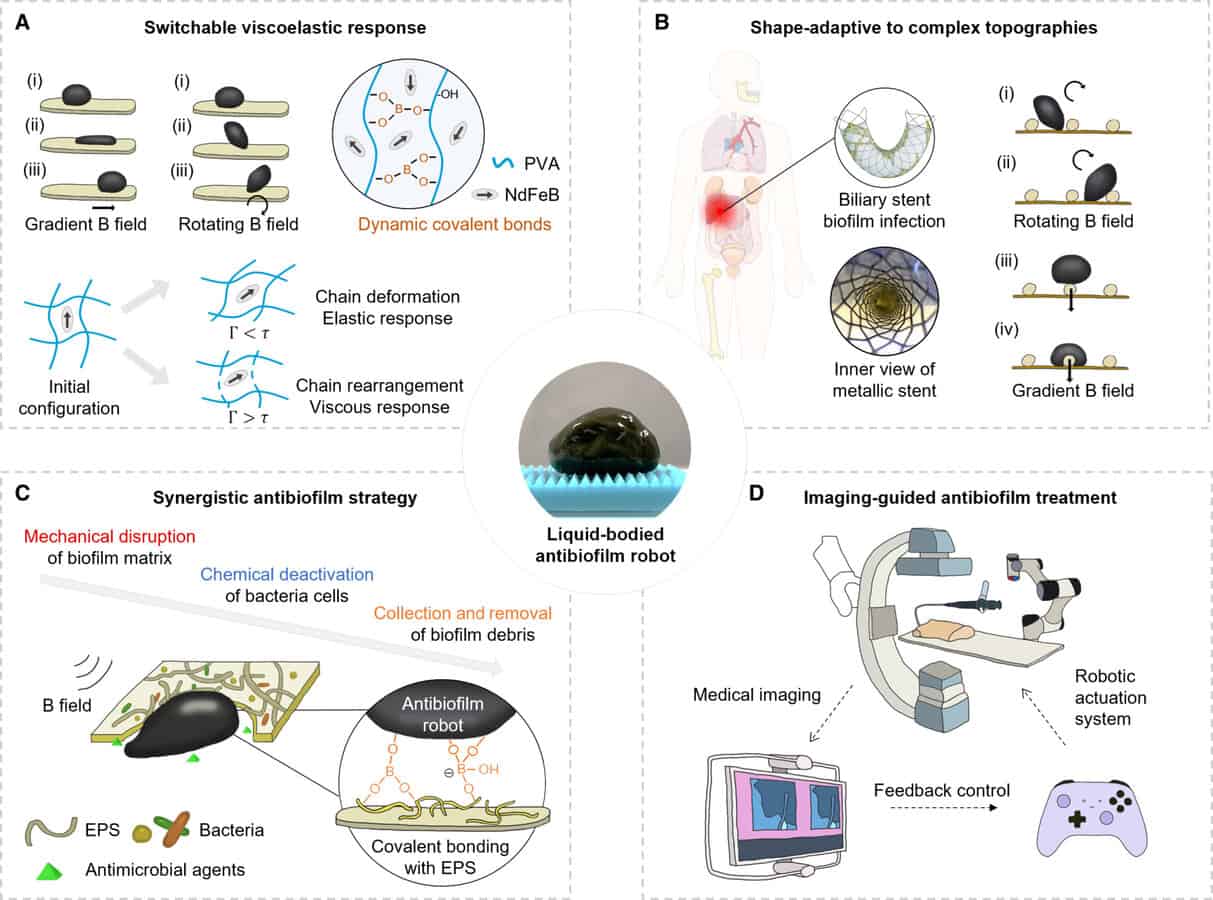 最近由香港中文大學(CUHK)領導的國際科研團隊,開發出一種創新「液態磁控機械人」(Liquid-bodied Antibiofilm Robot),不僅能穿越複雜的醫療植入物表面,還可直接破壞細菌膜,並同時殺滅病菌。這款液態機械人由磁性水凝膠構成,內含微型磁性粒子。透過外部磁場的控制,它能自由改變形狀,輕鬆穿過如支架或醫療網片等複雜結構的縫隙和表面。研究指出,機械人在磁場驅動下,可以透過機械力直接破壞細菌膜結構,同時釋放抗菌藥物,達到化學和機械雙重抗菌效果。