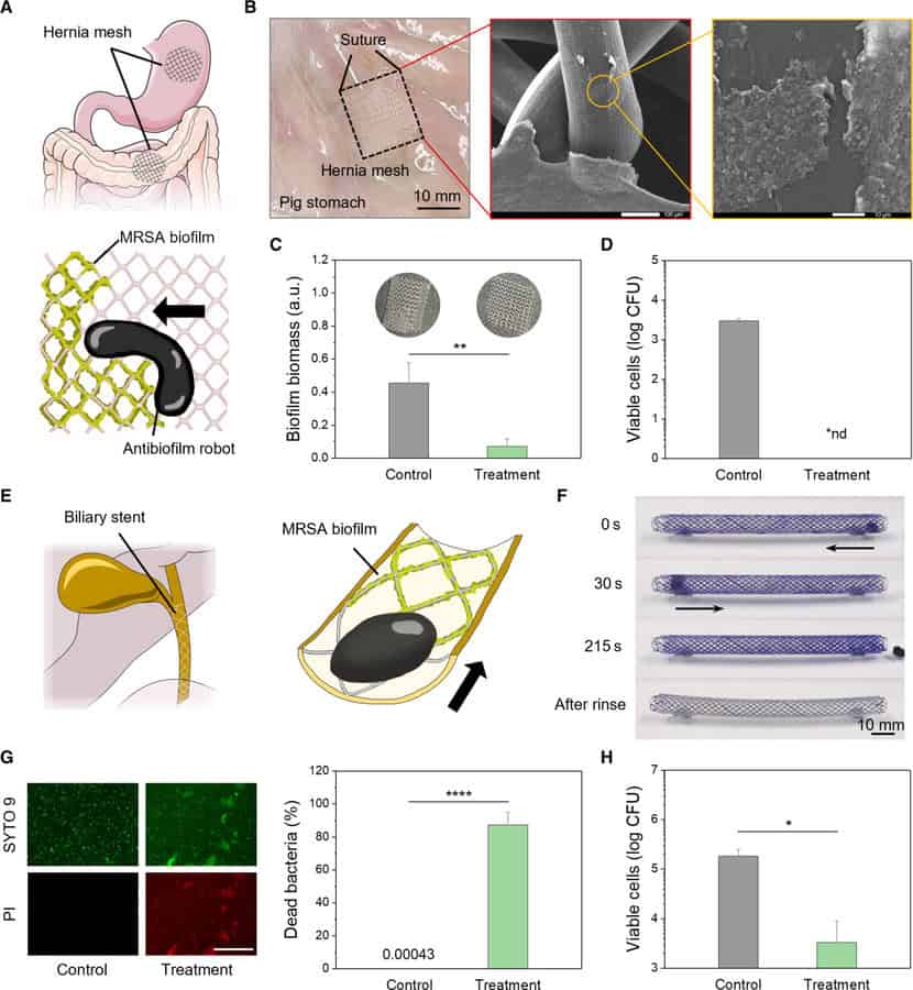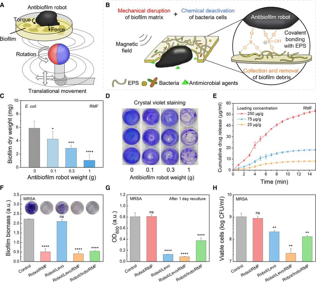 更值得一提的是,該機械人能「主動捕捉」被破壞後的細菌膜碎片,防止細菌再次擴散或重新感染。研究團隊以人工培養的細菌膜進行測試,證實該機械人在短短數分鐘內便能清除高達八成以上的細菌膜和病菌。