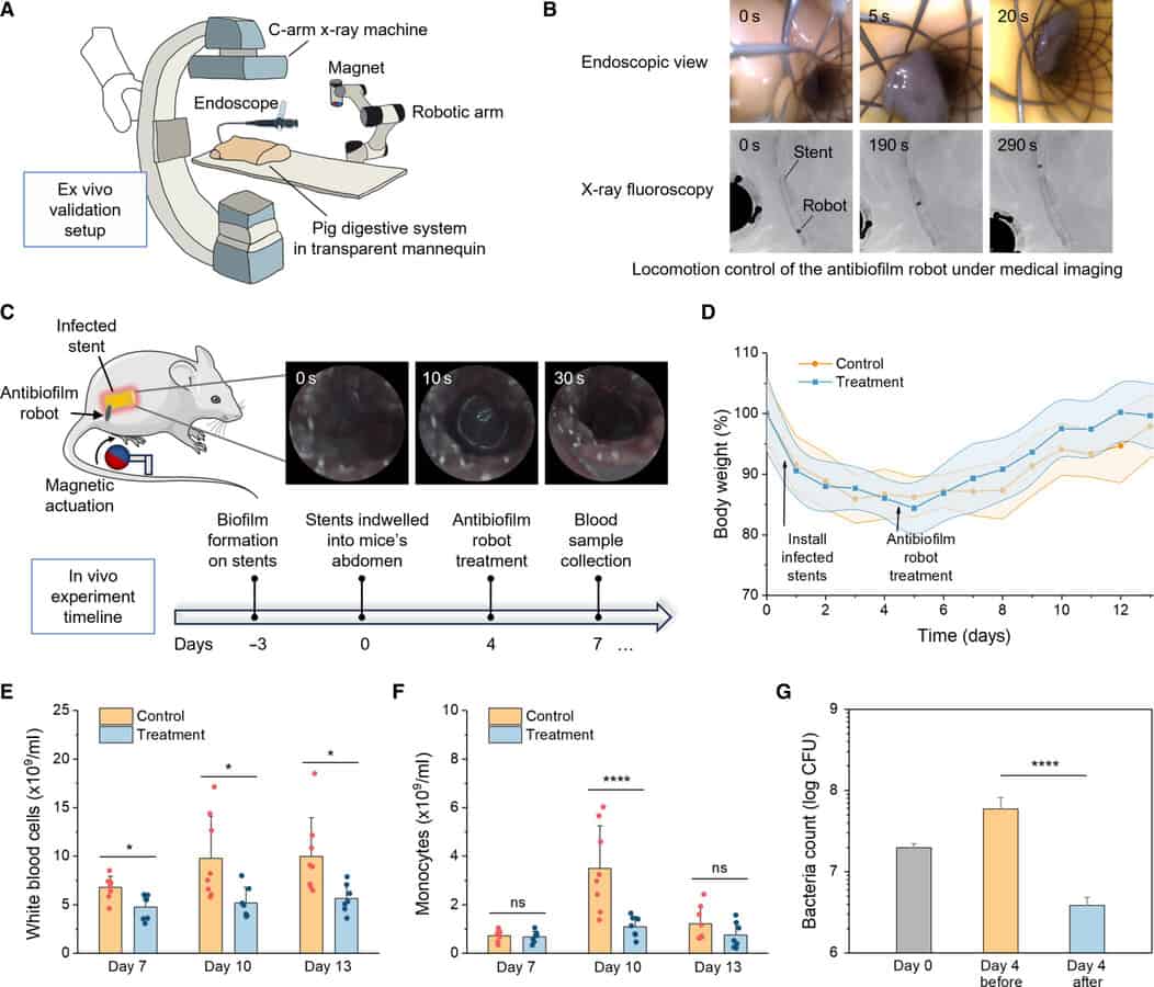 此外研究團隊還透過豬膽管及老鼠的活體實驗驗證了此技術的可行性。在豬膽管測試中,液態機械人成功在內窺鏡和X光追蹤下,穿越複雜的金屬膽管支架表面,清除了表面的細菌膜。在老鼠實驗中,受細菌感染的植入支架在機械人治療後,細菌數量明顯下降,老鼠的體重和健康狀況也比未治療的對照組恢復得更快。