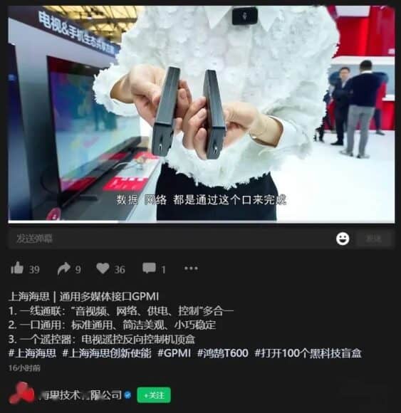 隨著中國電視品牌在全球市場份額逐年攀升,近日由深圳市「8K 超高清視頻產業協作聯盟」主導,並聯合華為海思、TCL、海信、創維等多家頂尖企業共同研發的 GPMI(通用多媒體接口)標準正式發布。預期新視訊插口標準打破 HDMI 接口的專利壟斷,並解決過去傳統視訊設備需要分別連接電源線和視訊信號線的繁瑣問題,實現了更高效的音視頻數據傳輸。