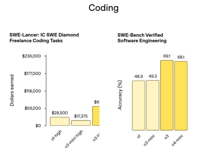 ▲o3 在 SWE-bench Verified 測試中得分 69.1%,o4 則為 68.1
