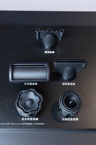 下圖最上為順滑風嘴,吹送更多負離子,有助減少毛躁達 46% ,為用家帶來自然順滑的效果;第二排左邊為抗毛躁風嘴,將毛躁髮絲隱藏於較長髮絲之下,以塑造滑順效果;右邊則為精準集風嘴,集中氣流以達至更精準局部造型;最底左邊為柔和乾髮風嘴,均勻地分散氣流,更溫和呵護頭皮;右邊則為快速乾髮風嘴,為每日快速乾髮而設。產生高速氣流以快速乾髮。