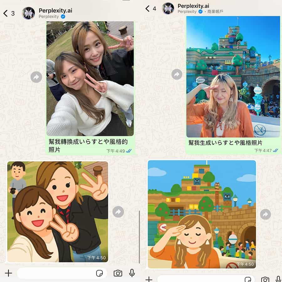 完成儲存後,打開 WhatsApp 搜尋並開啟與「Perplexity.ai」的對話視窗。你只需傳送想轉換的照片,再在對話欄輸入:「幫我生成いらすとや風格的相片」。