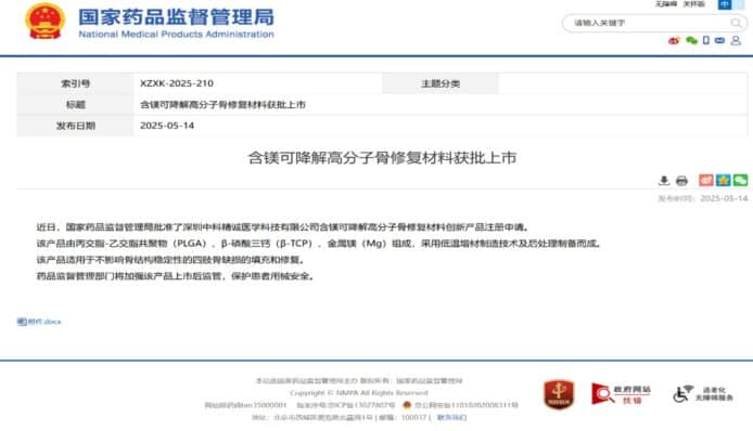 香港中文大學醫學院秦嶺教授團隊與深圳先進技術研究院醫工所賴毓霄團隊合作,成功研發「含鎂可降解高分子骨修復材料」,近日通過國家藥監局審查,獲批作臨床應用。此項目歷時 15 年,為全球首個獲批的鎂相關人工骨植入材料,填補了行業空白。