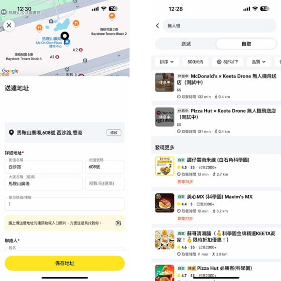根據平台資訊,Keeta 無人機外送服務的取餐點設於馬鞍山公園小食亭附近,而麥當勞和 Pizza Hut 的出餐點則位於新界沙田白石角香港科學園內。兩地步行距離約需 1 小時 30 分鐘,駕車約 11 分鐘。媒體早前報道指出,Keeta 無人機送餐單程飛行時間預計約 10 分鐘。