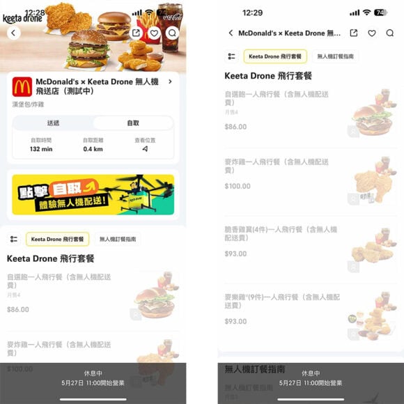 麥當勞方面表示,無人機外送服務尚未啟動,正式推出日期訂於 6 月初,屆時會同步推出宣傳活動,平台目前顯示的營業時間並非準確資料。Keeta 方面則暫未公布無人機配送服務試運行的最新進展。