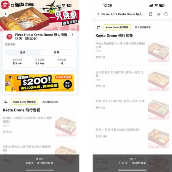 現在只要在 KeeTa 應用程式中,將送餐地址設定為「馬鞍山廣場」,再後搜尋「無人機」選自取,可找到兩家與 Keeta Drone 合作的餐廳。兩家店舖均標示「測試中」狀態,系統顯示「休息中,5 月 27 日 11:00 開始營業」。