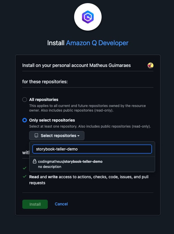 首先,在 GitHub 中安裝 Amazon Q Developer ,您可以立即開始使用它。選擇 Only selected repositories 並增加到 storybook-teller-demo 儲存庫中。