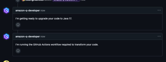 Amazon Q Developer 將在後台工作,然後在拉取請求上產生用家可以審查的代碼。而這次執行工作的是 Amazon Q 轉換代理,它專門負責代碼遷移,並將採取所有必要的步驟來分析代碼並遷移到 Java 17。
