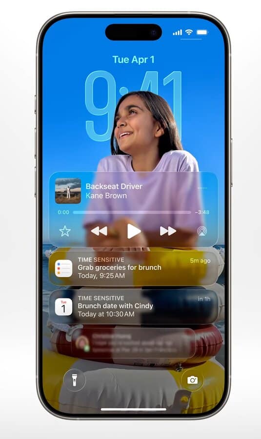 跨平台體驗方面,新設計延伸至 iOS、iPadOS、macOS、watchOS 及 tvOS,更新鎖定畫面、主畫面、桌面及 Dock 等系統體驗。鎖定畫面上的時間現由 Liquid Glass 打造,流暢適應以優雅地融入照片主體背後。在主畫面及桌面上,Dock、應用程式圖示及小工具均由多層 Liquid Glass 打造。