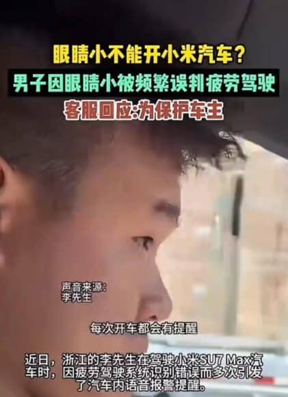 浙江一名李姓男子駕駛小米 SU7 Max 期間,屢次遭遇車內疲勞駕駛警報無故響起。他指系統經常誤判,單程就會觸發超過 20 次提示,更因自己眼睛細小,頻繁遭系統當作瞌睡處理。雖則行車時精神集中,但系統仍不斷發出語音警告與畫面提示,令他大感困擾。