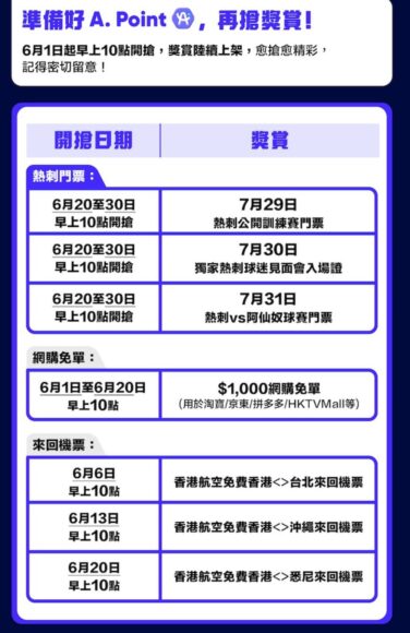 由 6 月 20 日至 7 月 14 日,AlipayHK 亦推出以 A. Point 兌換門票的活動,用戶於本地或跨境消費每港幣1元可賺取1個 A. Point,然後可在 App 內指定時間兌換活動門票,包括公開訓練門票(價值港幣 299元)及正賽門票(價格由港幣 399 元至港幣 2,499 元),更有機會獲得出席熱刺球員見面會的資格。相關活動名額每日有限,建議用戶提早行動。(詳情請收看 App 內資訊)