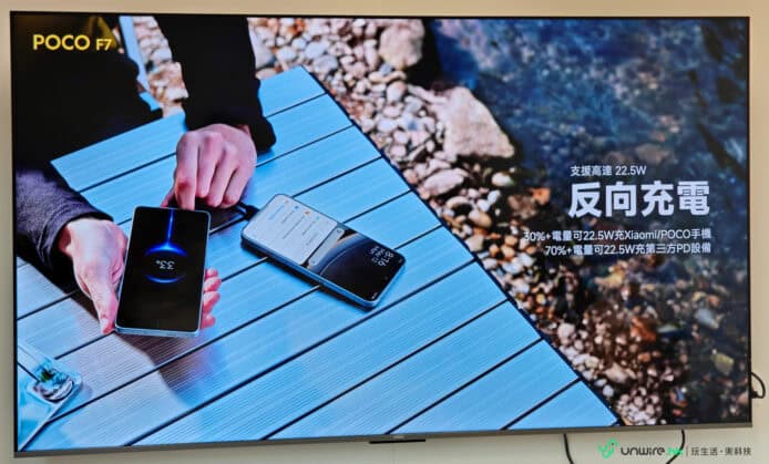 ▲POCO F7 亦有十分特別的逆向有線充電功能,而且支援火數高達 22.5W,可反向為其他裝置快速回電。