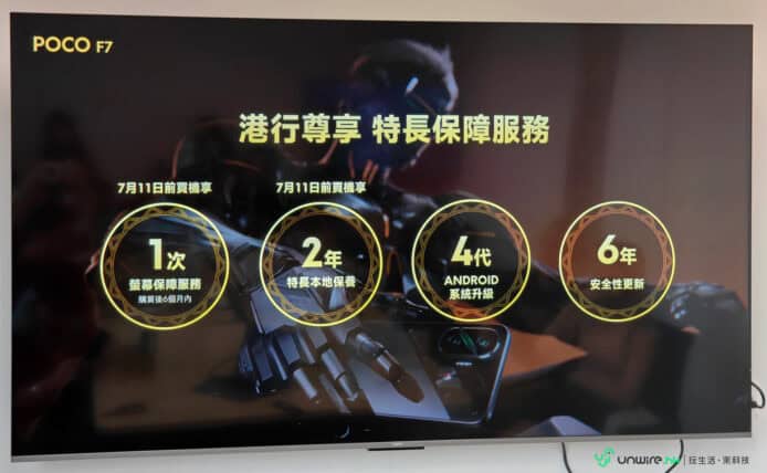 ▲POCO F7 會在今日正式推出,設有 12 + 256 及 12 + 512 兩個配置,定價分別為 $2,799 及 $2,999,亦會附送港行的特長保障服務。
