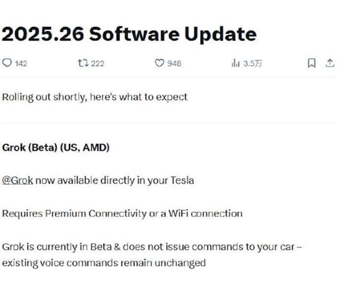 Elon Musk 本週較早時已經透露,特斯拉將逐步把 Grok 整合到旗下汽車當中。今次更新屬於實驗性質,目標是測試 Grok 在車內環境的運作表現,以及收集用戶反饋數據,為下一階段更新做準備。